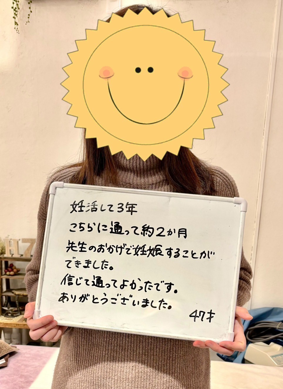 今まで身体も心も妊活に左右される時間が長かったけど、やっと一歩先に進むことができました。終わりの見えない妊活ですが、私はここに通えて本当によかったです。